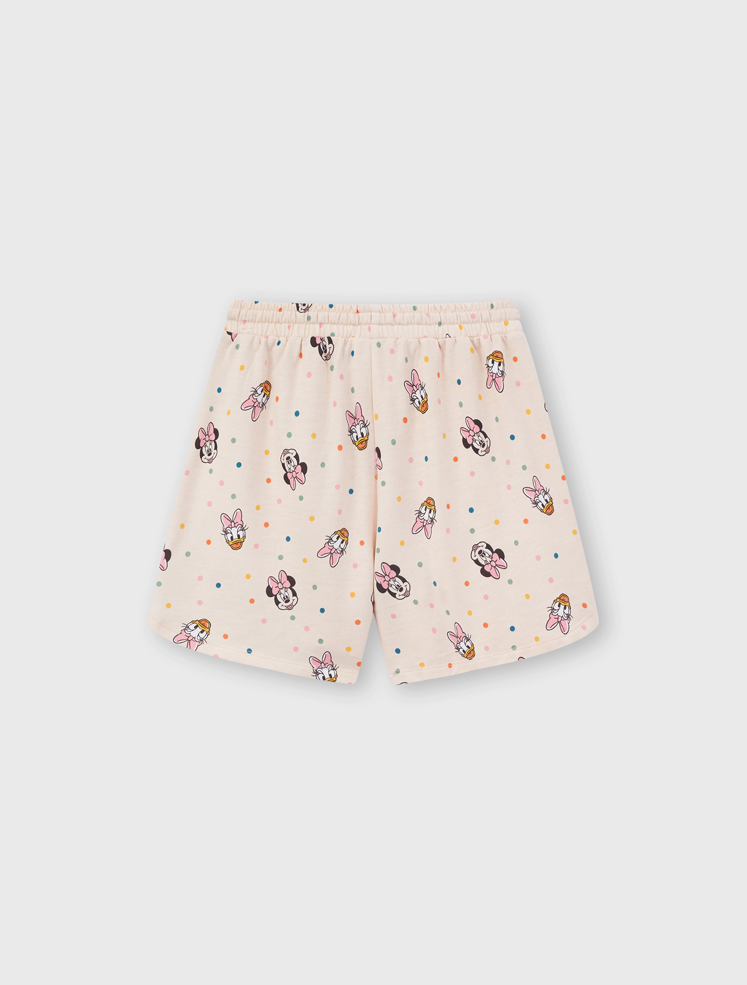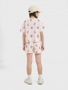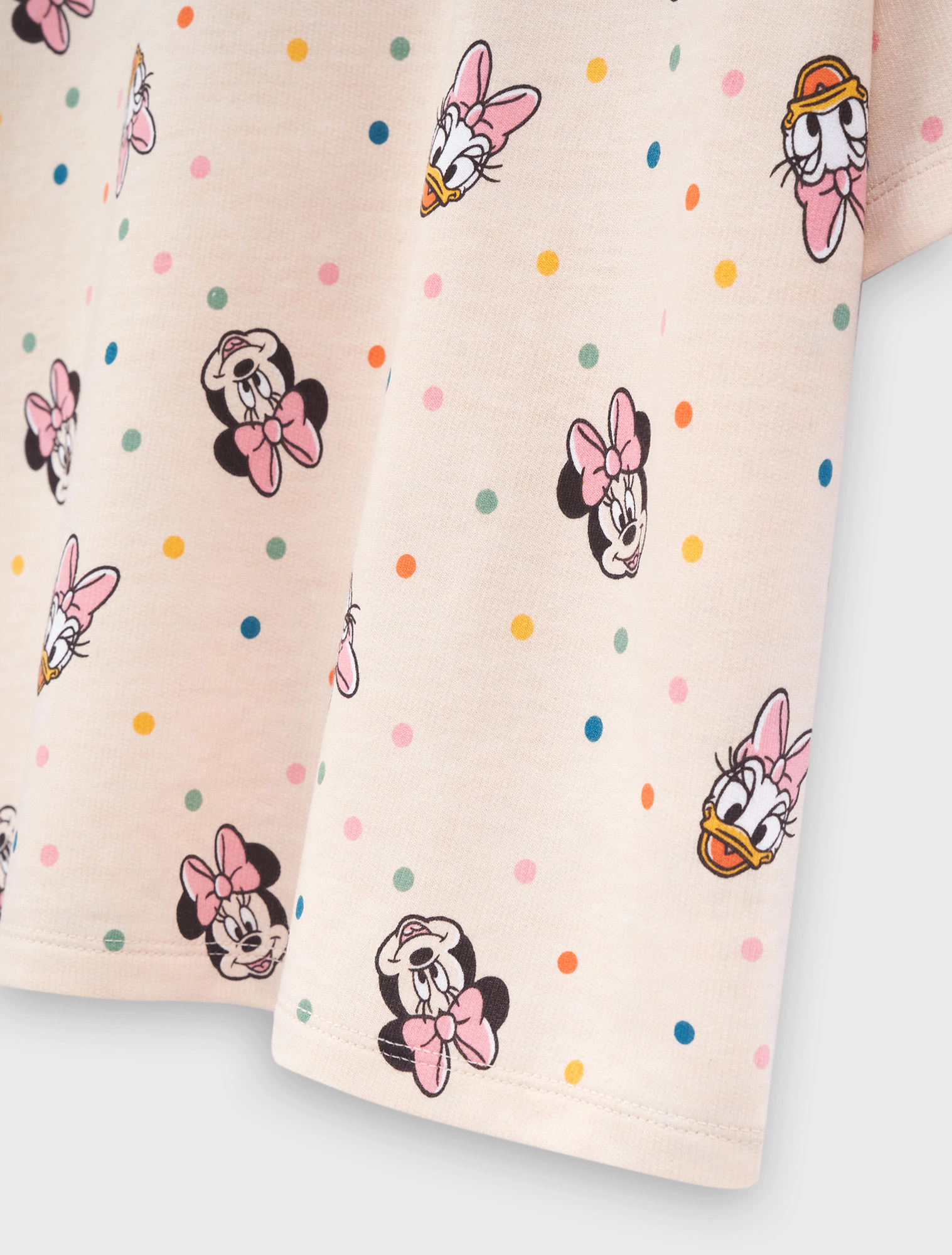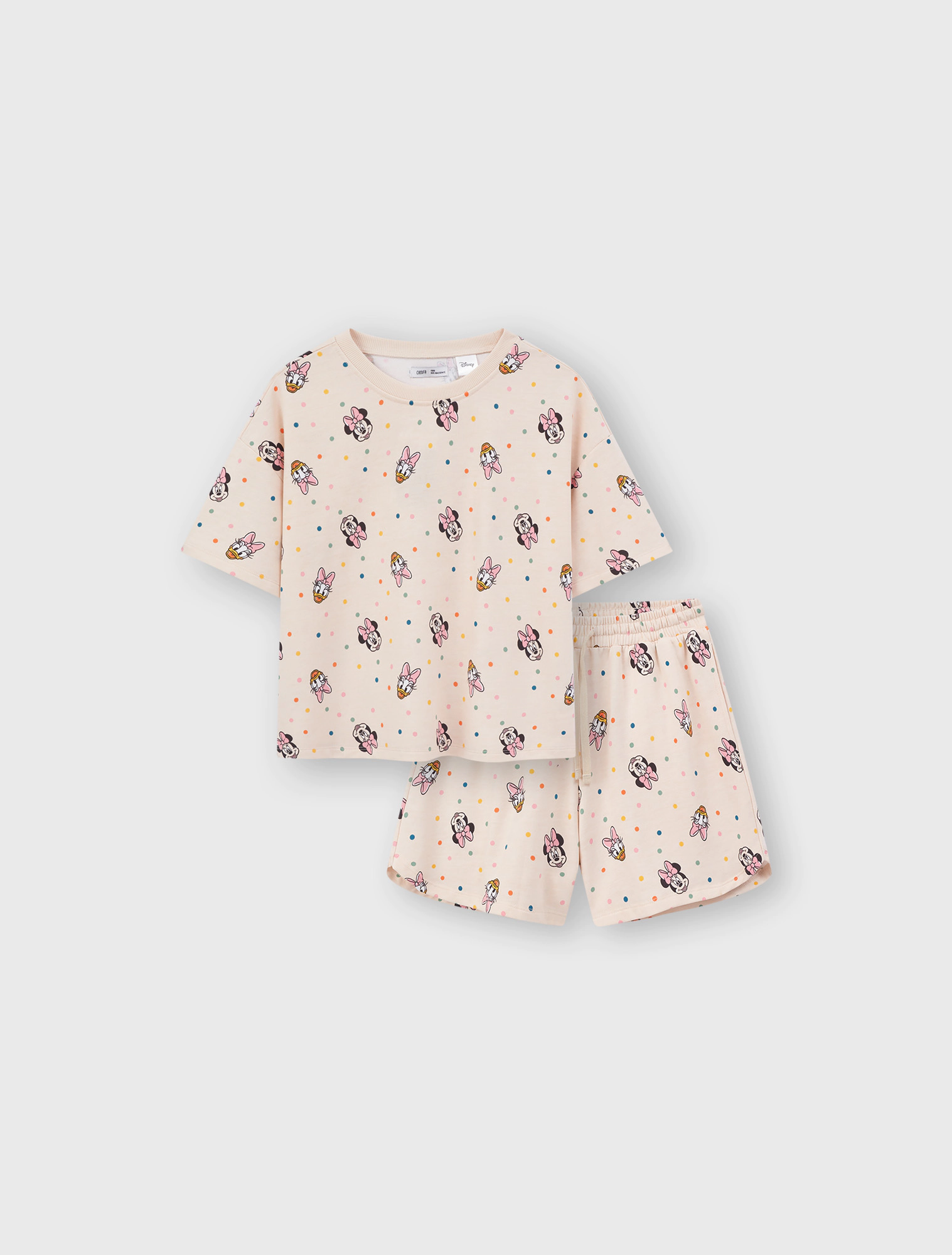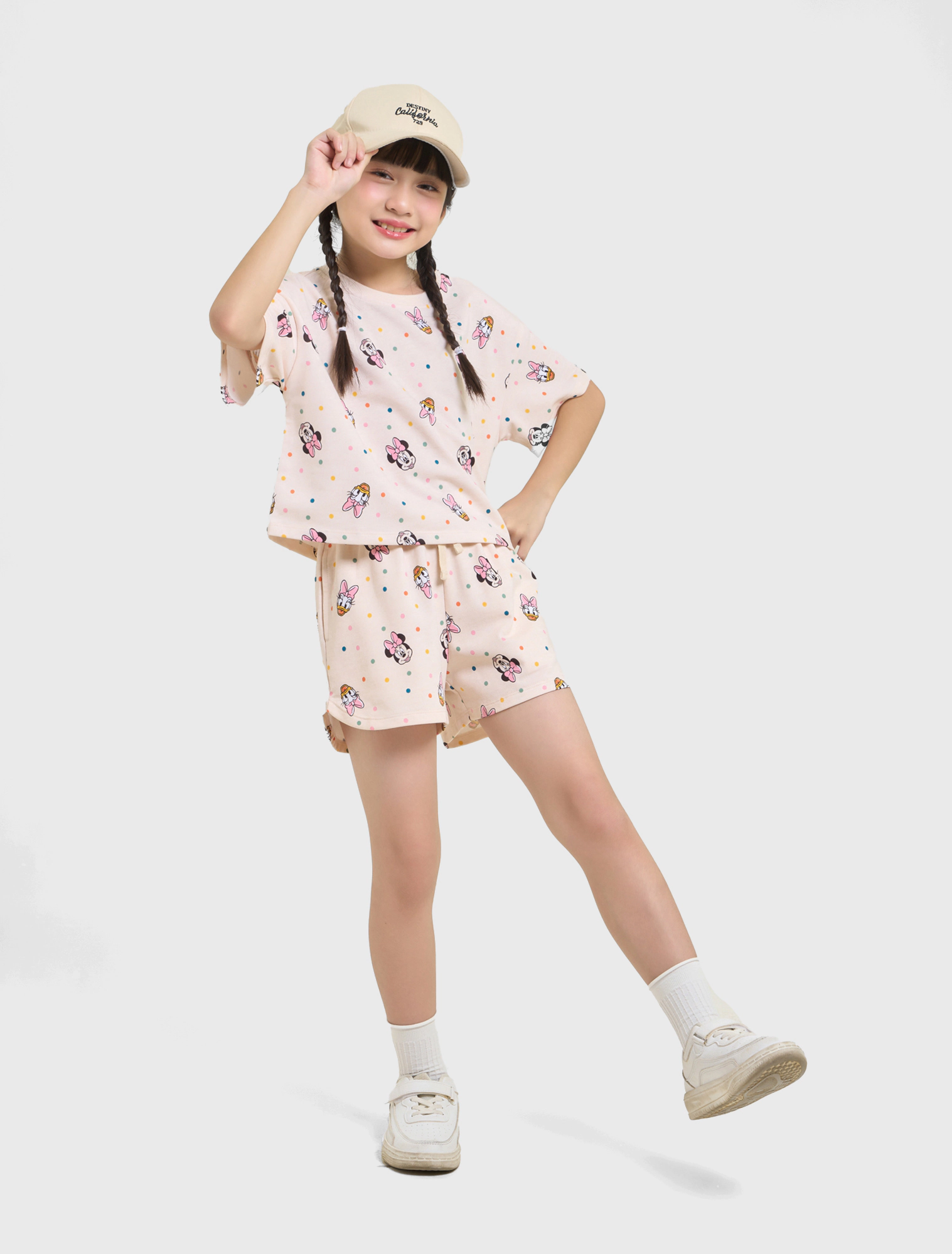 Áo cổ tròn ngắn tay, quần sooc gấu sườn lượn cong cách điệu, phom dáng suông thoải mái, màu sắc tươi sáng, họa tiết Mickey đáng yêu phù hợp bé gái.