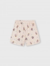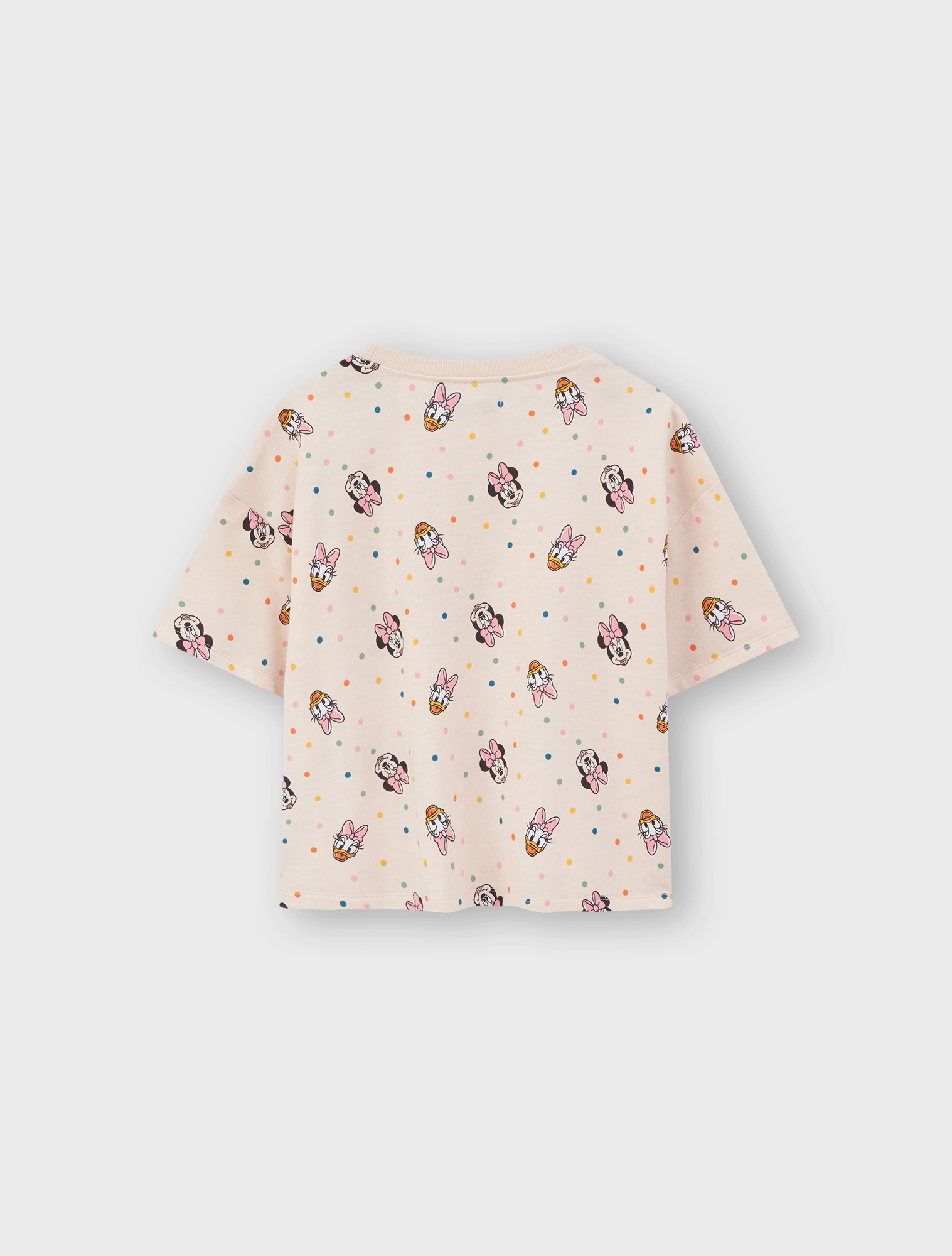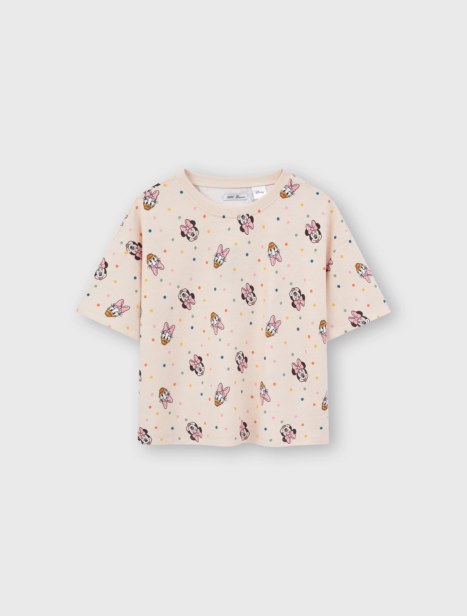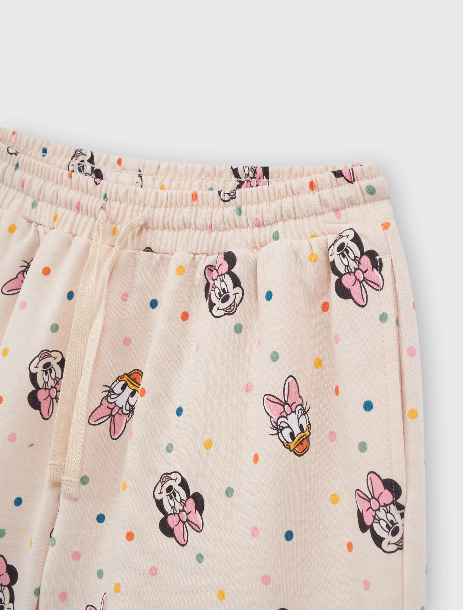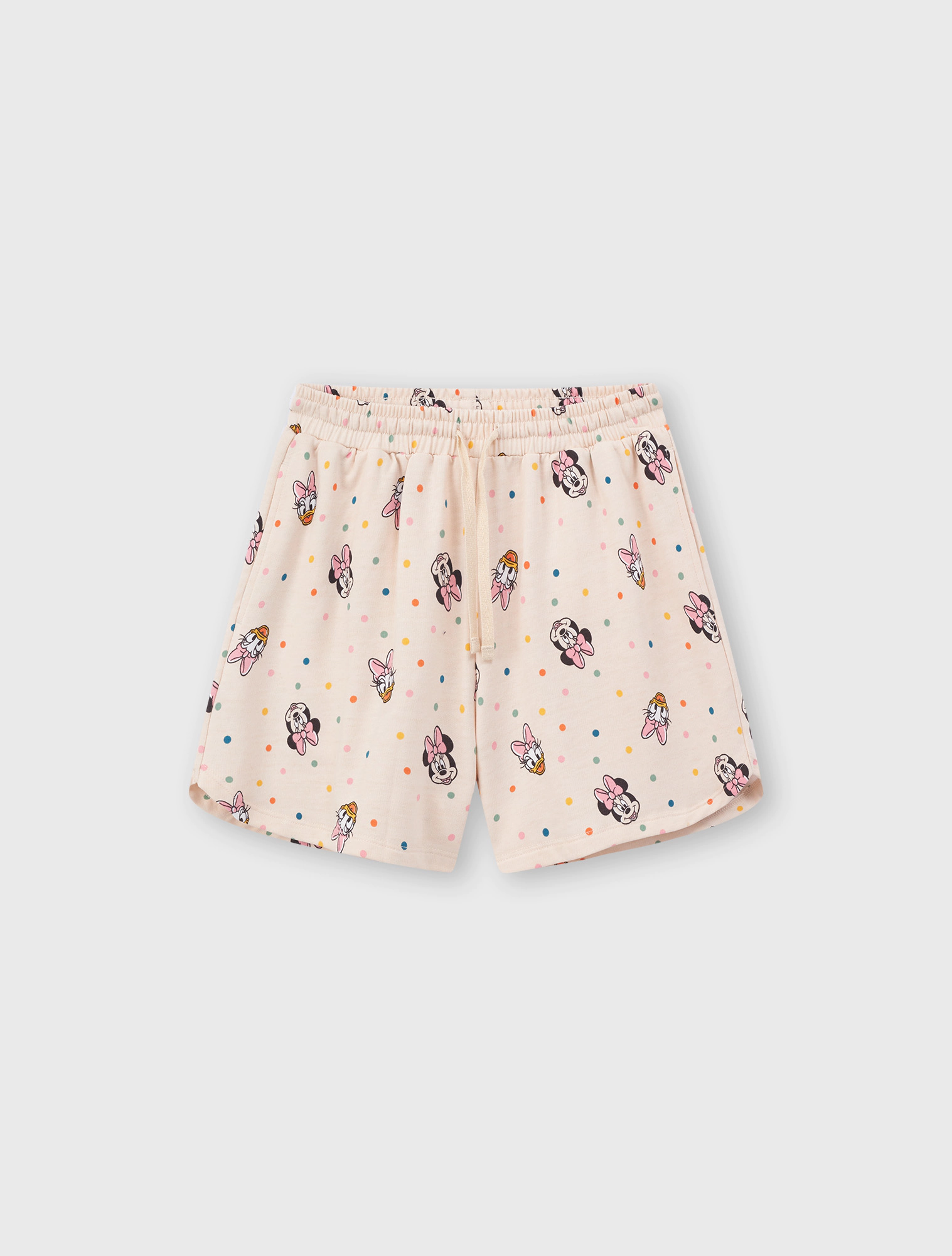 Áo cổ tròn ngắn tay, quần sooc gấu sườn lượn cong cách điệu, phom dáng suông thoải mái, màu sắc tươi sáng, họa tiết Mickey đáng yêu phù hợp bé gái.