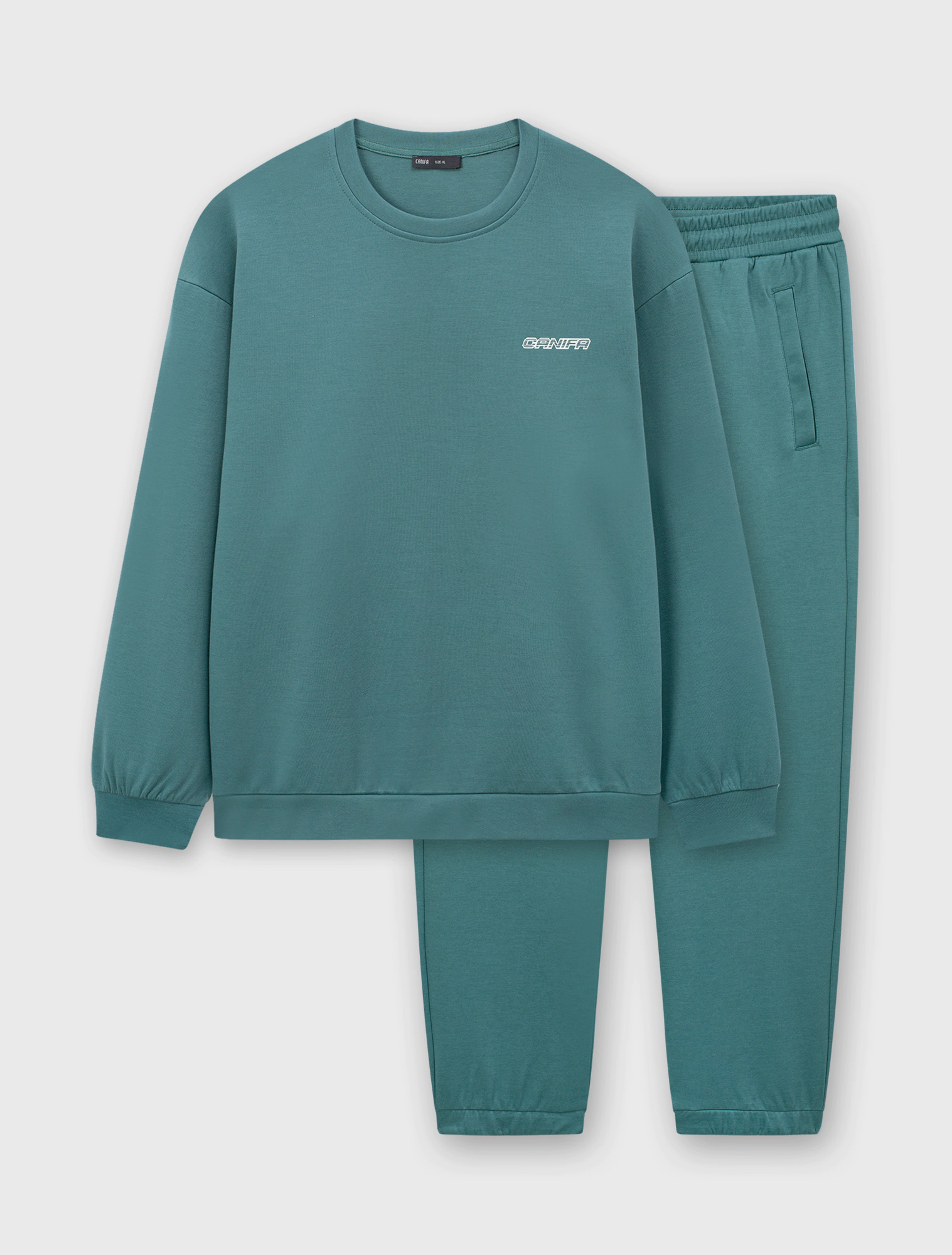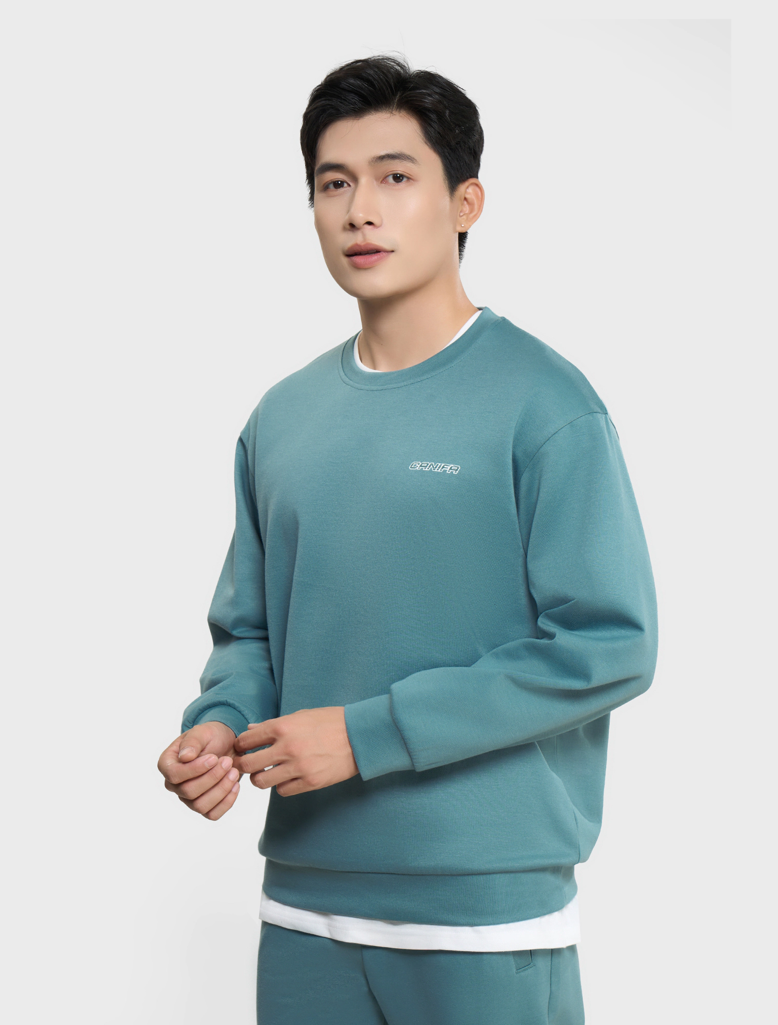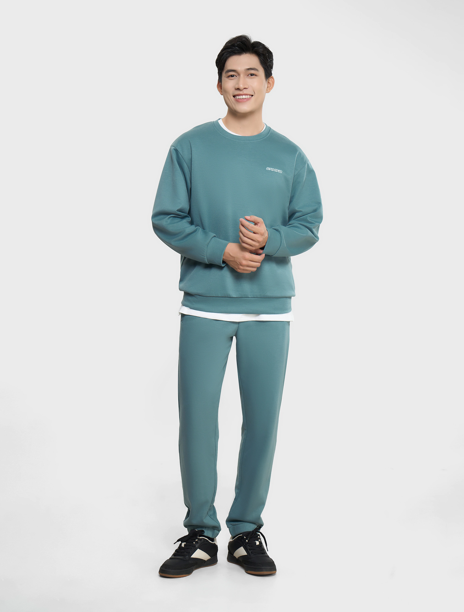 Bộ quần áo nỉ nam phom regular, điểm nhấn đồ họa nhẹ nhàng ở ngực áo. Màu sắc trung tính dễ mặc dễ phối đồ