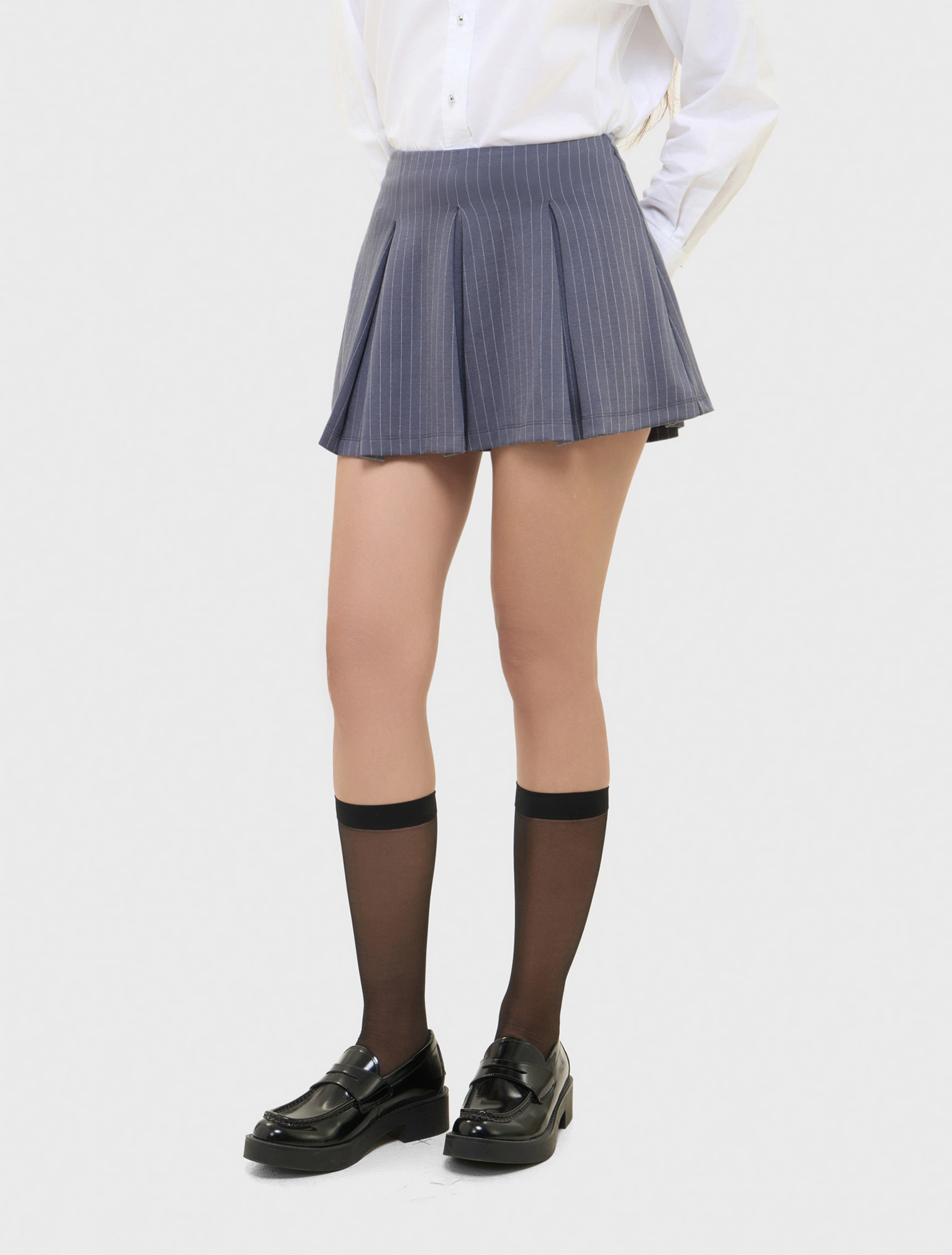 Chân váy nữ ngắn dáng xoè, với các chi tiết xếp ly to tạo độ xoè và vải dệt kẻ sọc nhỏ, thiết kế váy ngắn với quần bên trong tạo sự an toàn tối đa khi sử dụng.