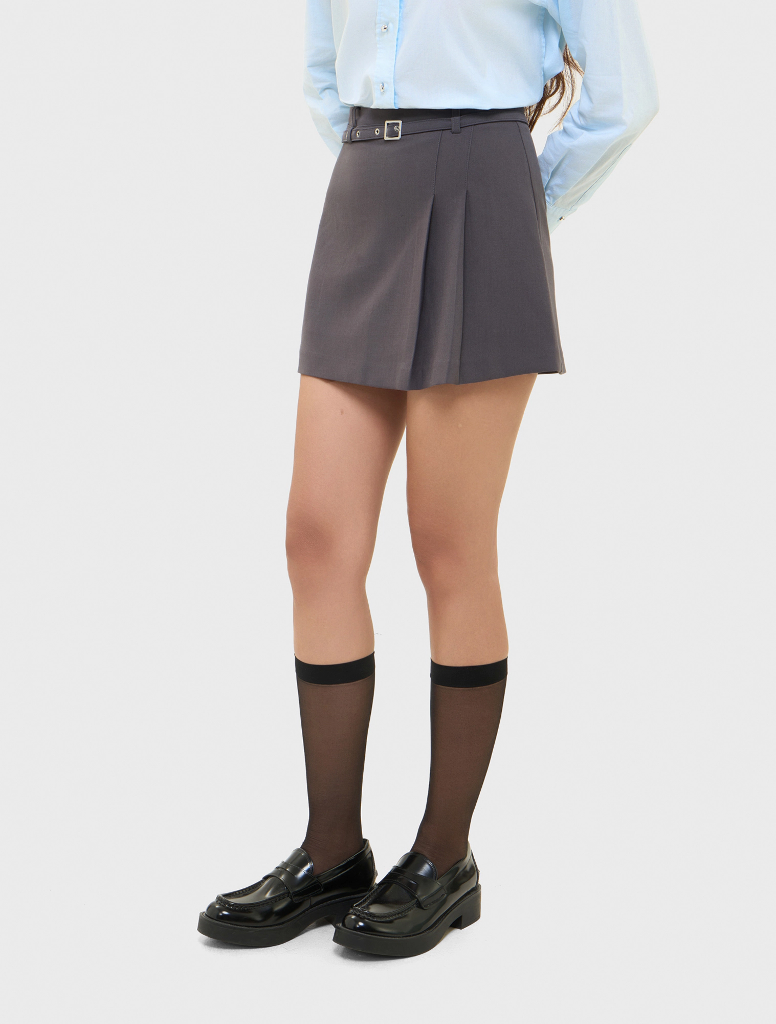 Chân váy nữ xếp ly, dáng ngắn, kéo khóa, có quần lót bên trong, có chi tiết thắt đai ở eo. Chất liệu polyester pha mềm mại. Phù hợp với môi trường đi chơi, dạo phố.