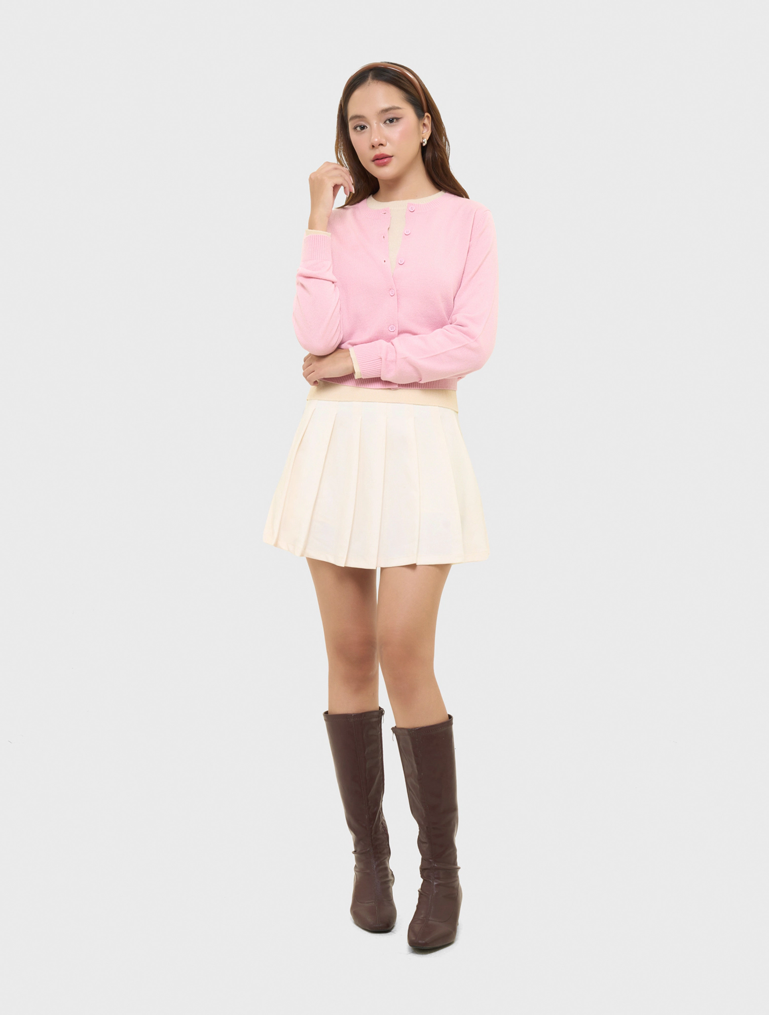 Chân váy nữ dáng xếp ly, có lót quần bên trong.