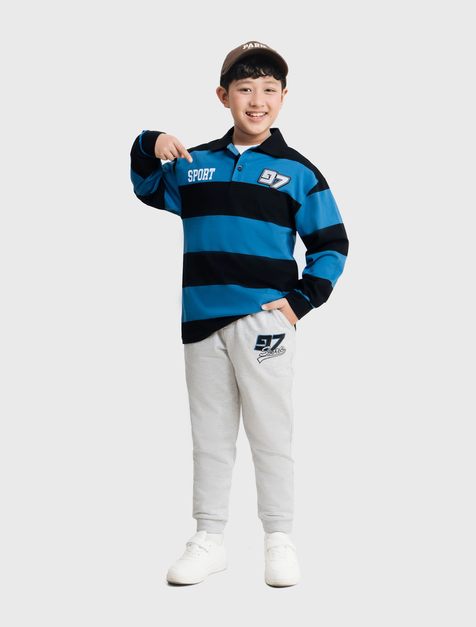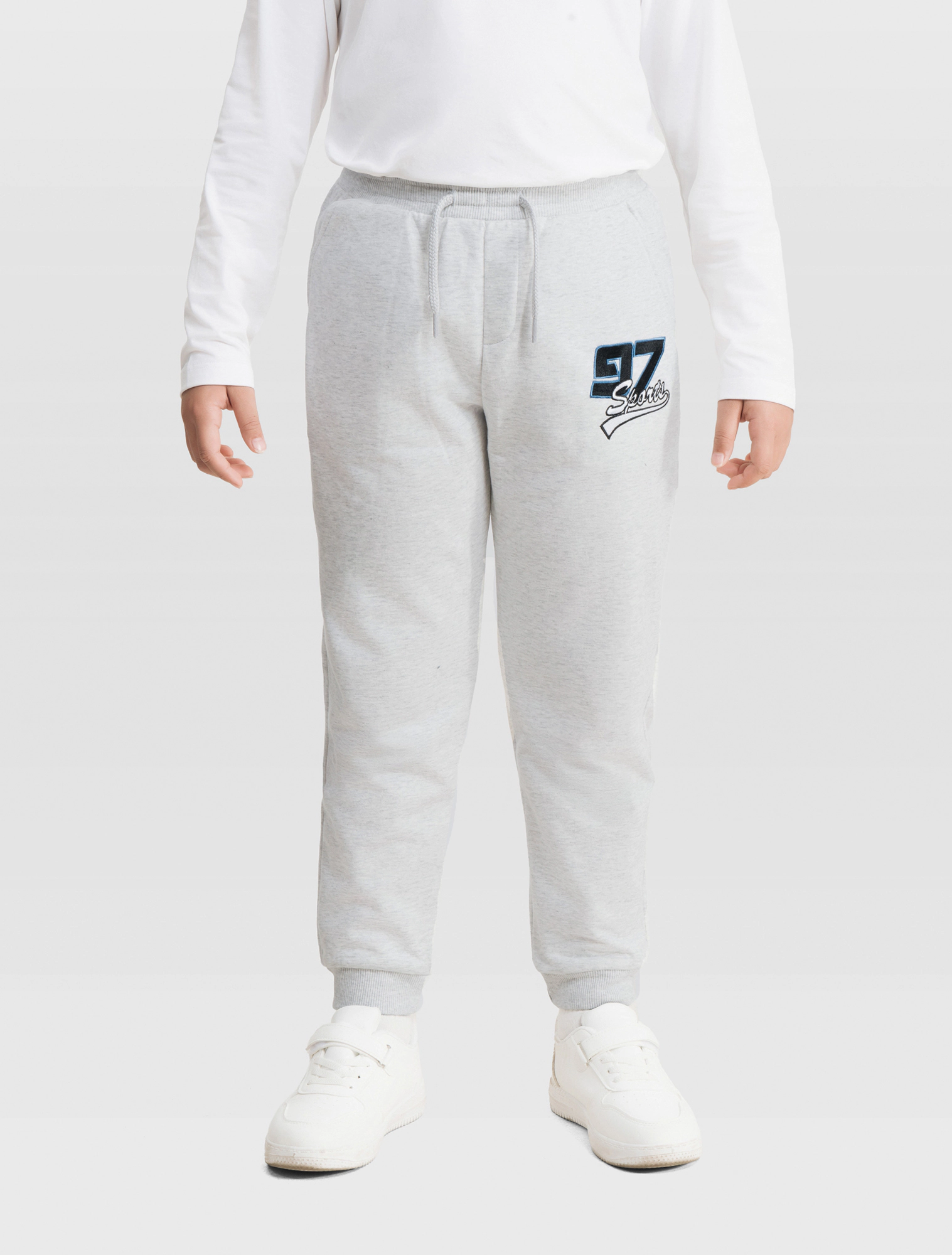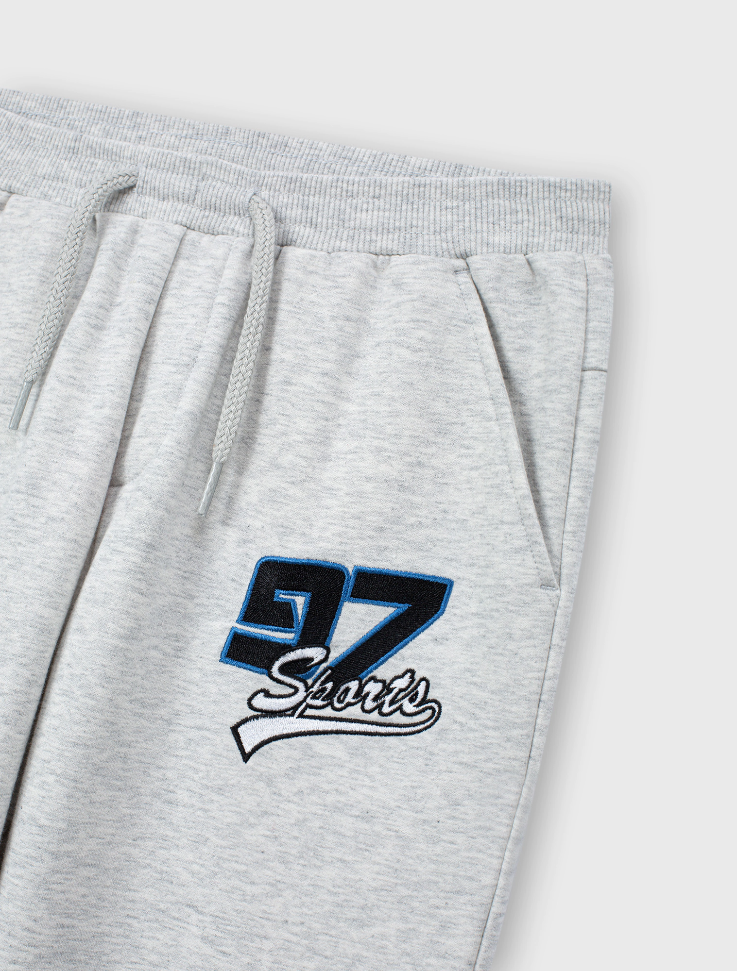 Quần dài bé trai có hình in thêu, phom dáng cơ bản, chất liệu vảy cá, hình in thêu sport khỏe khoắn cho các bé.