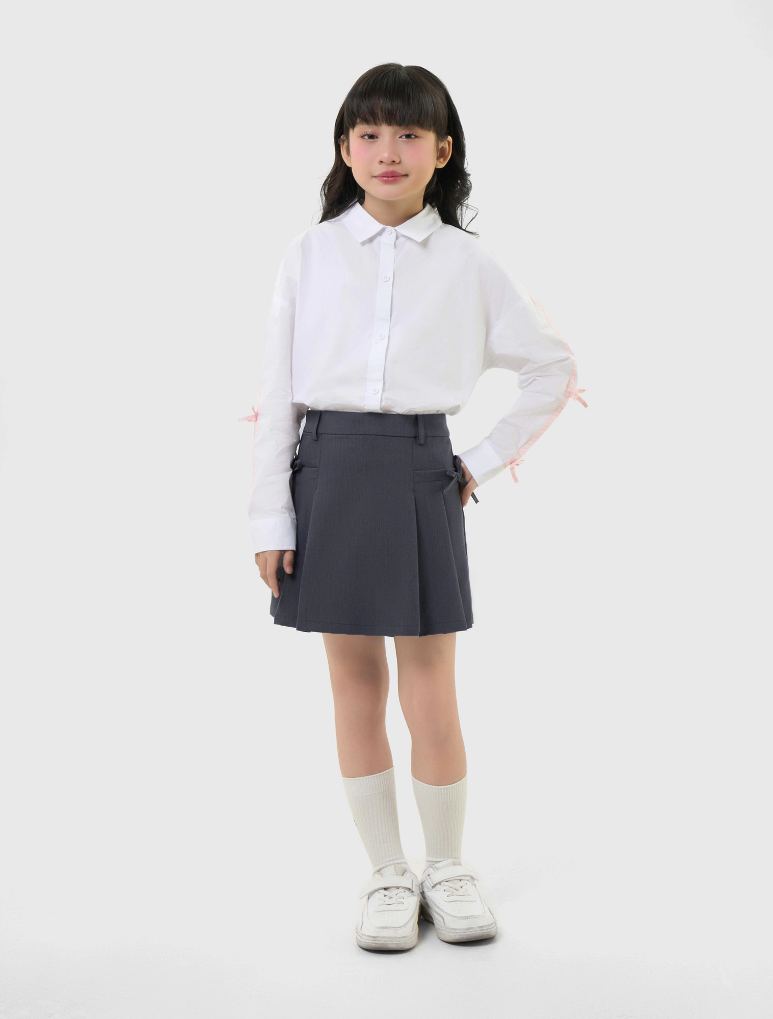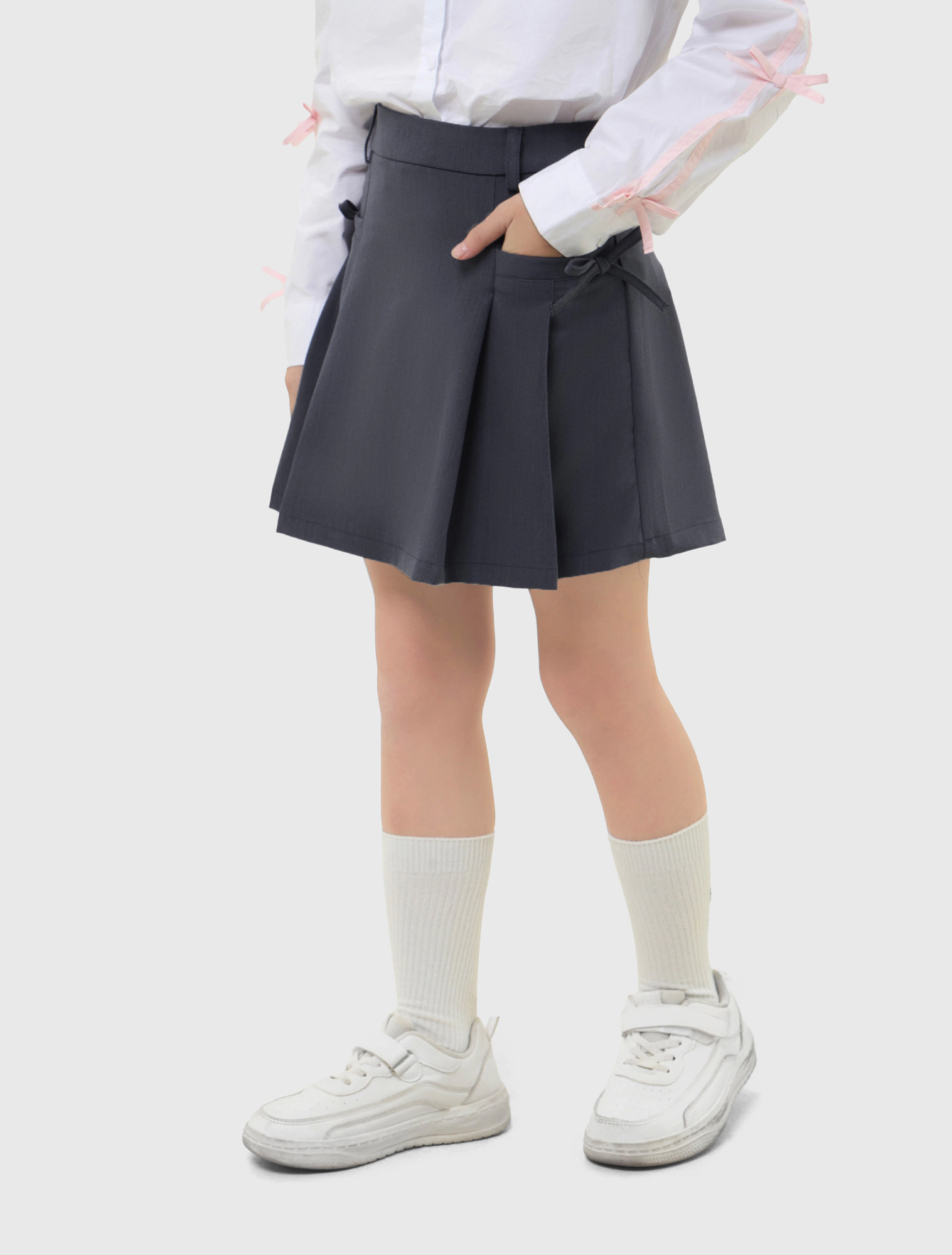 Quần giả váy bé gái. Chất liệu mềm mại, mịn mát, kiểu dáng xếp ly và đính nơ tạo nên một sản phẩm dễ dàng kết hợp với nhiều loại trang phục