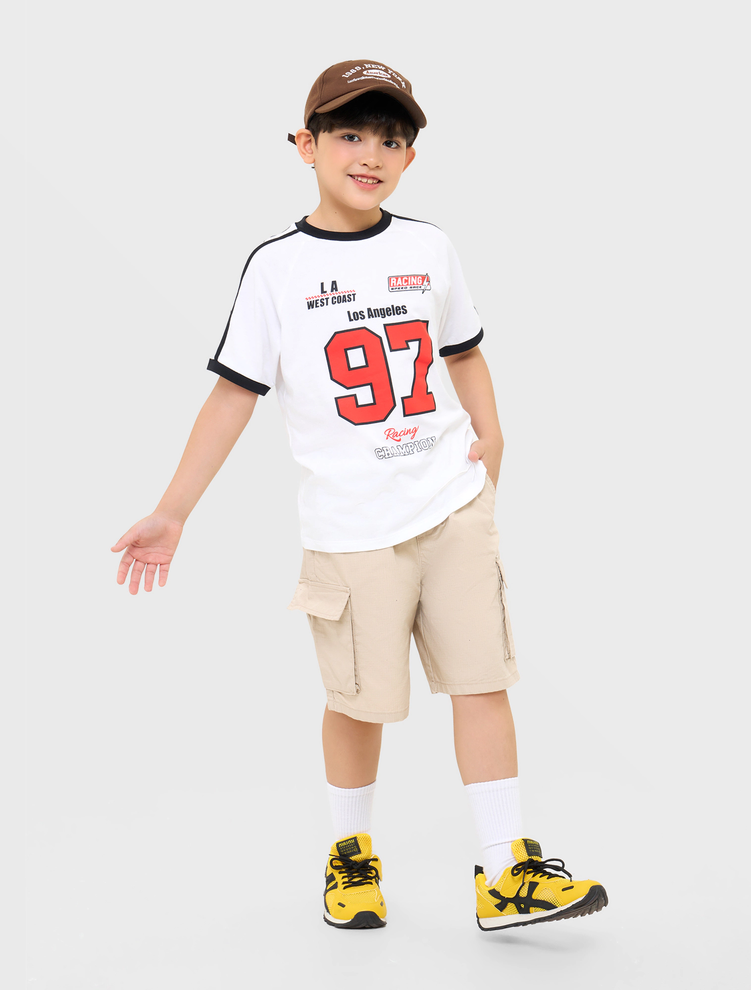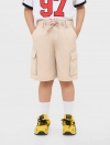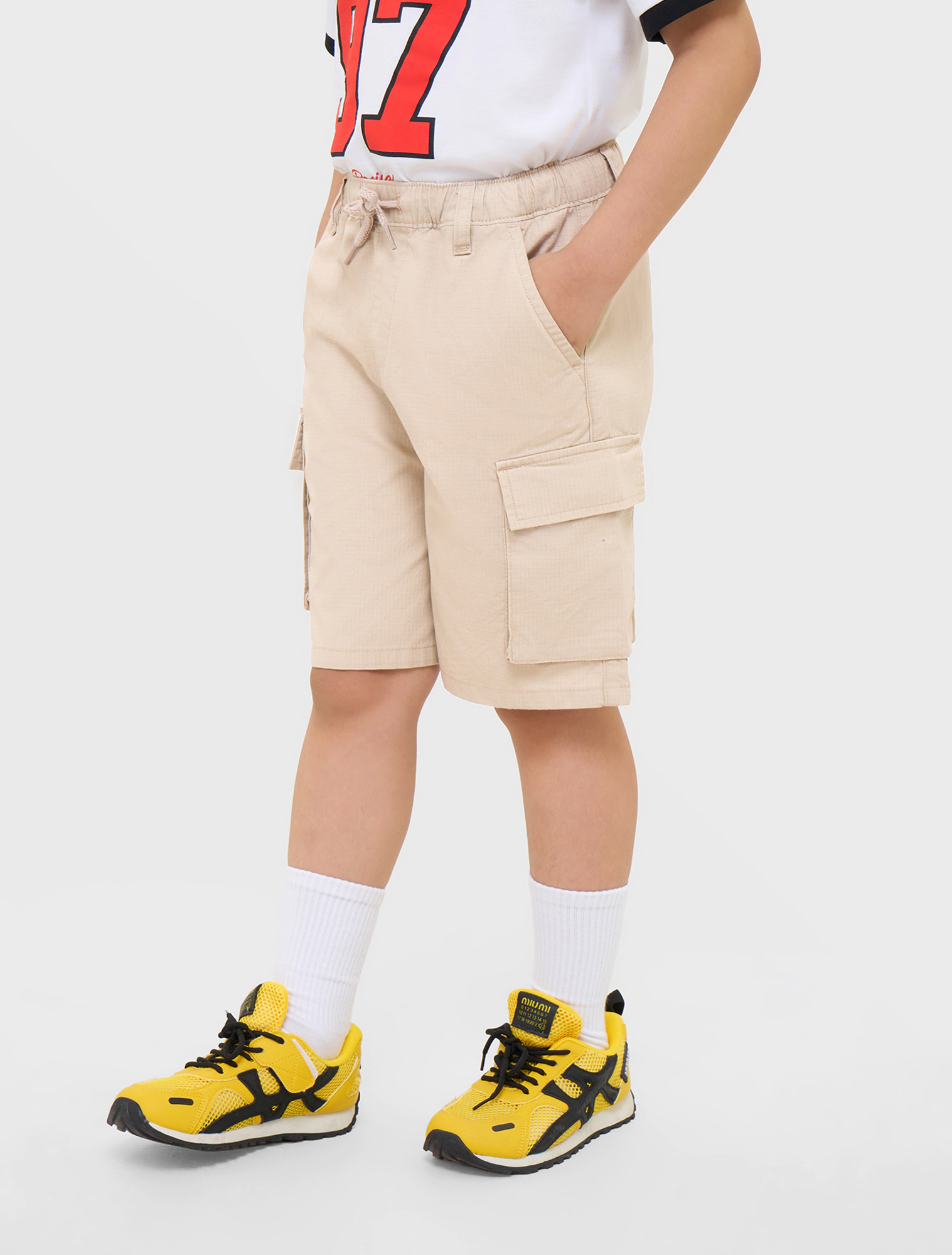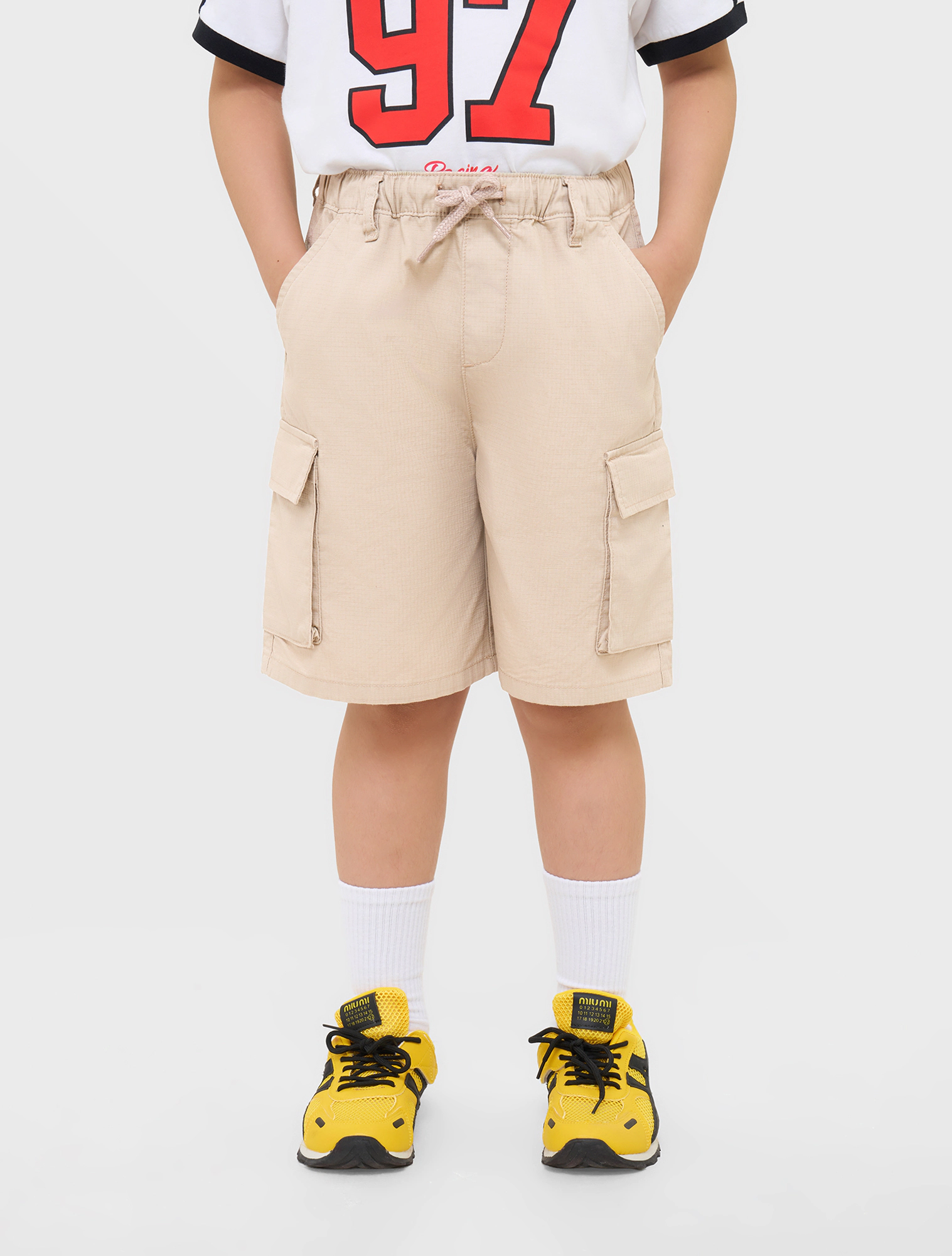 Quần soóc bé trai dáng suông, cạp chun, thiết kế túi hộp tiện dụng và cá tính.