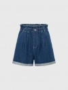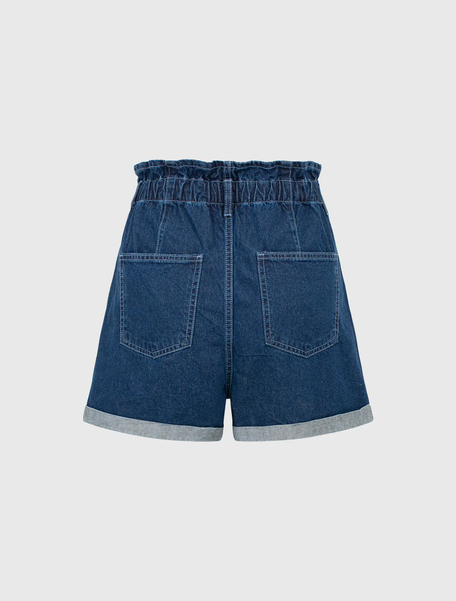 Quần soóc jeans nữ cotton cạp cao phối bèo dáng suông