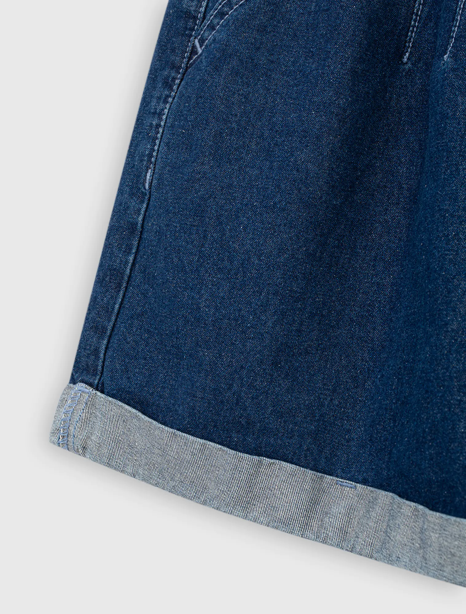 Quần soóc jeans phom vừa, dáng suông basic. Cạp cao có chun tạo sự thoải mái khi mặc.