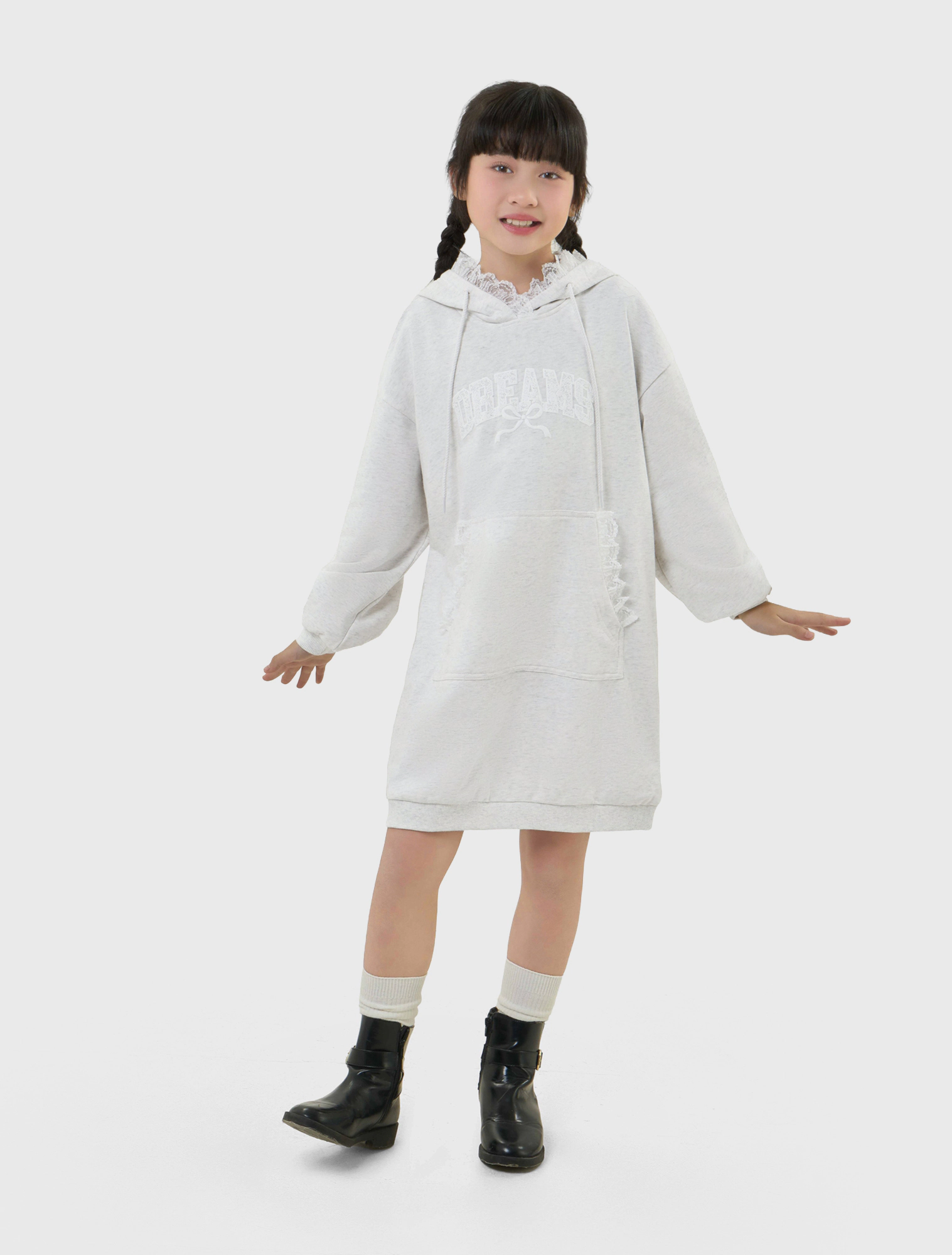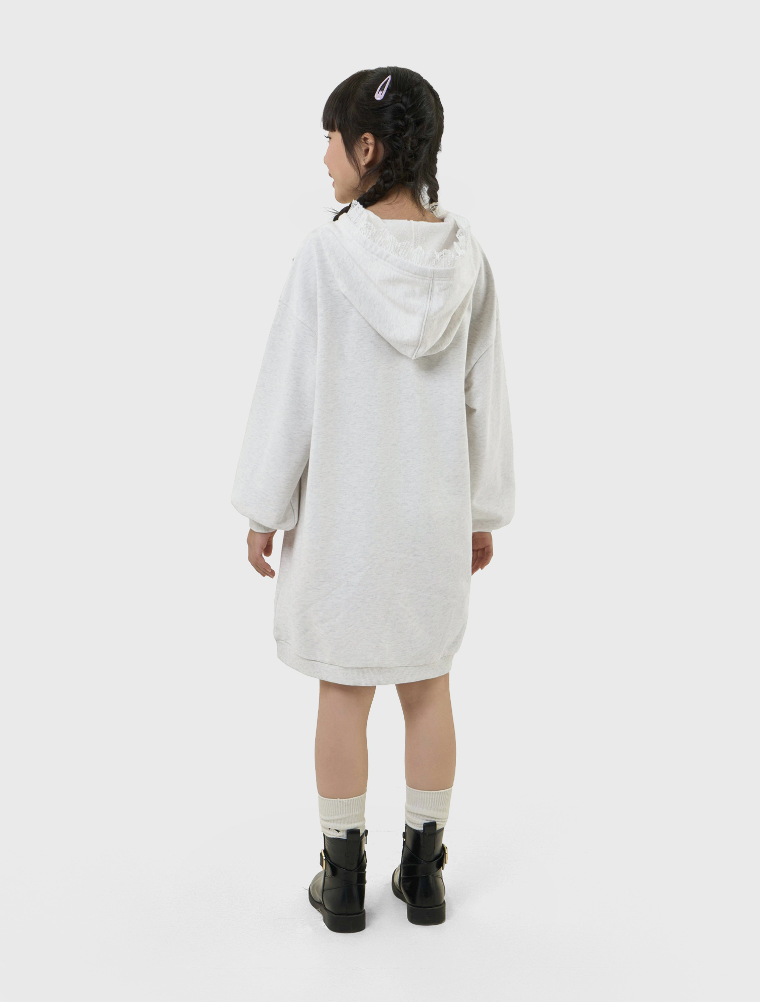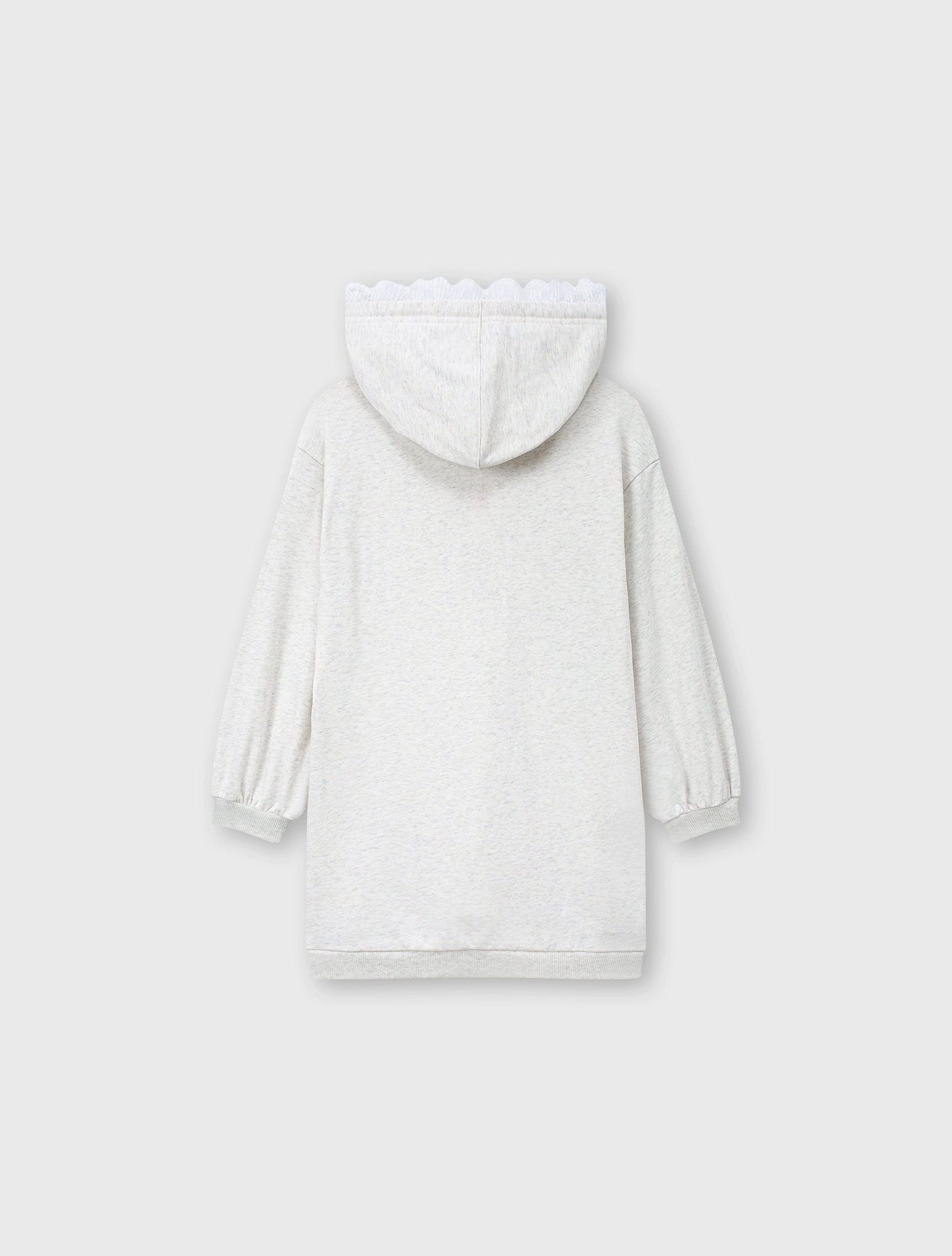 Váy nỉ có mũ bé gái. Chi tiết ren viền mũ tạo sự hấp dẫn cho các bé.