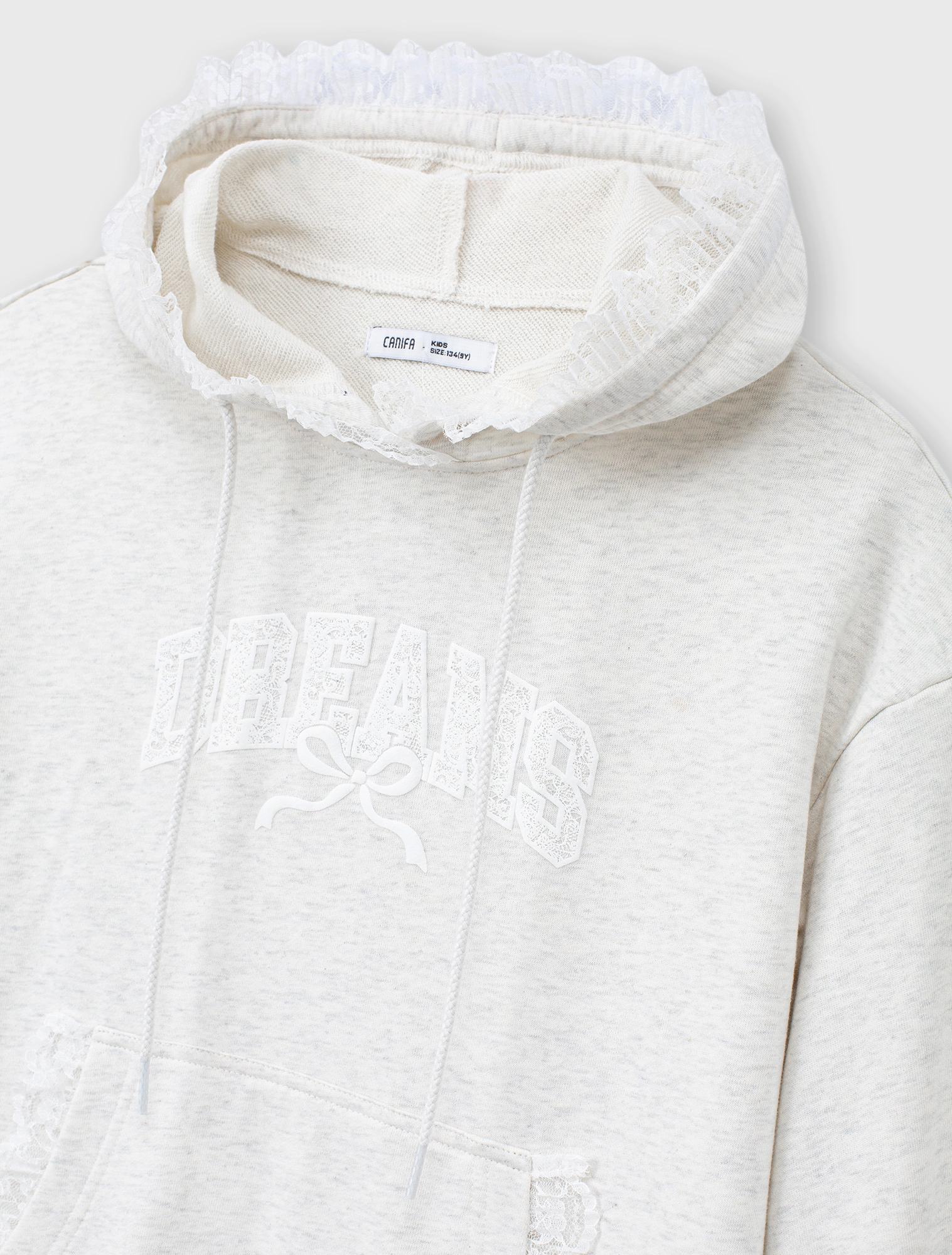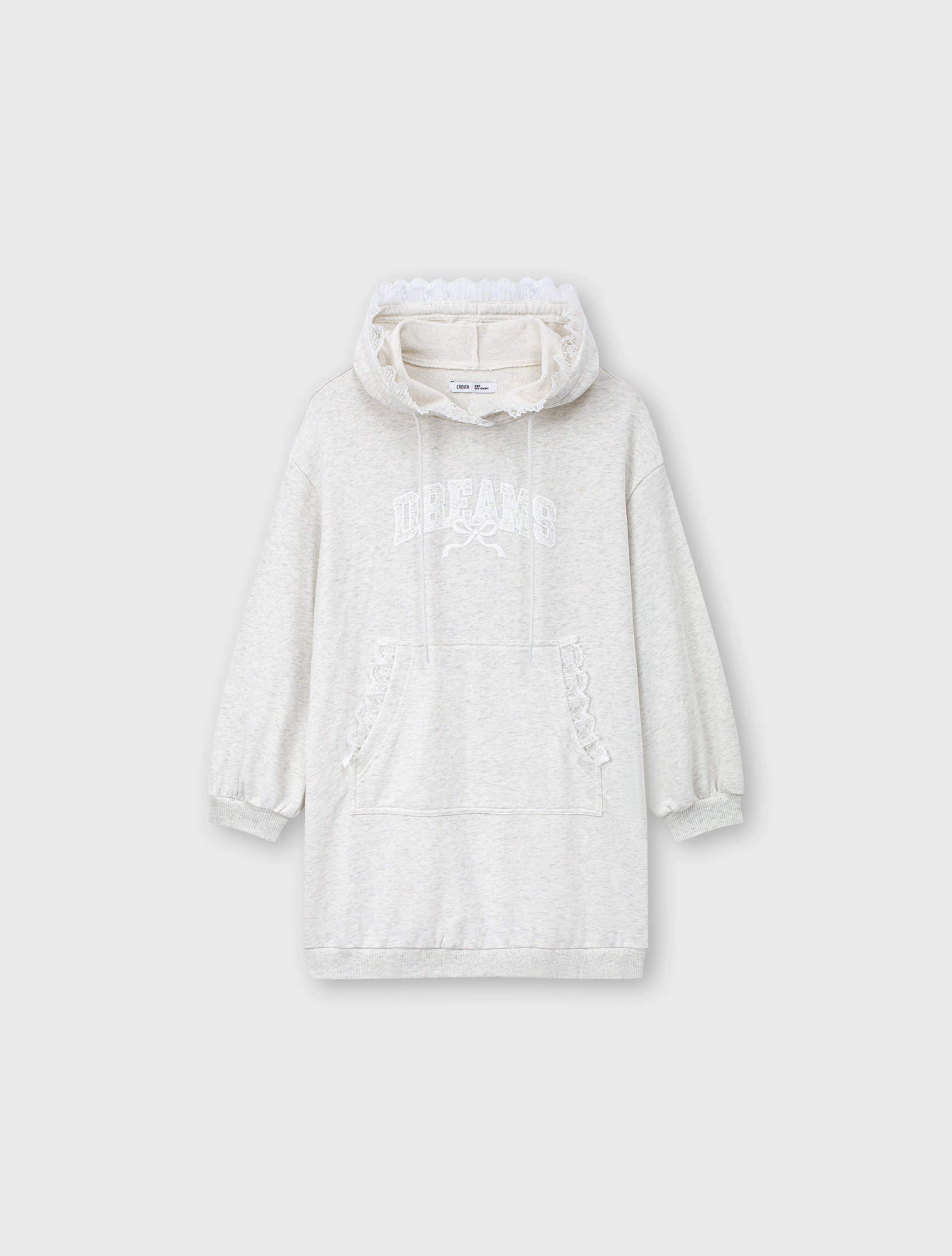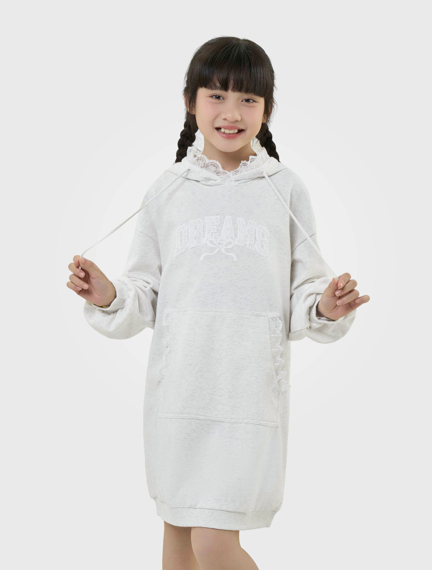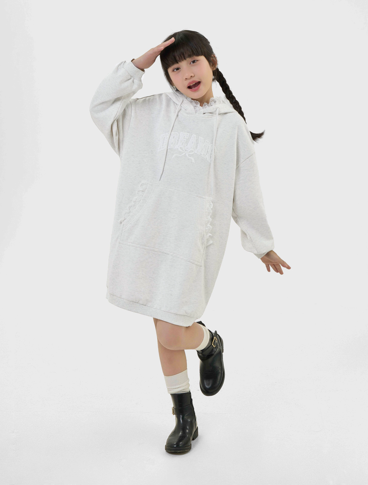 Váy nỉ có mũ bé gái. Chi tiết ren viền mũ tạo sự hấp dẫn cho các bé.