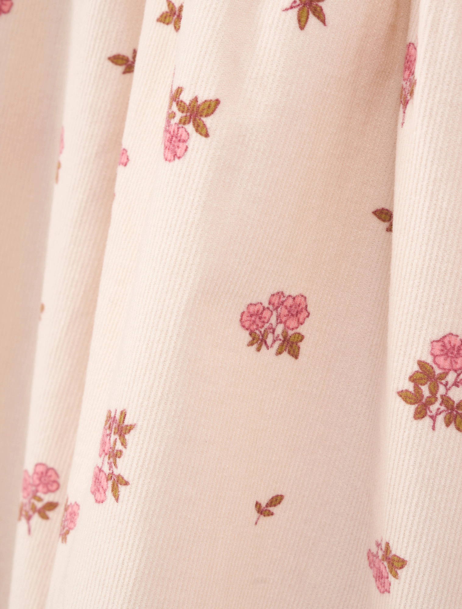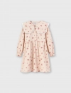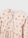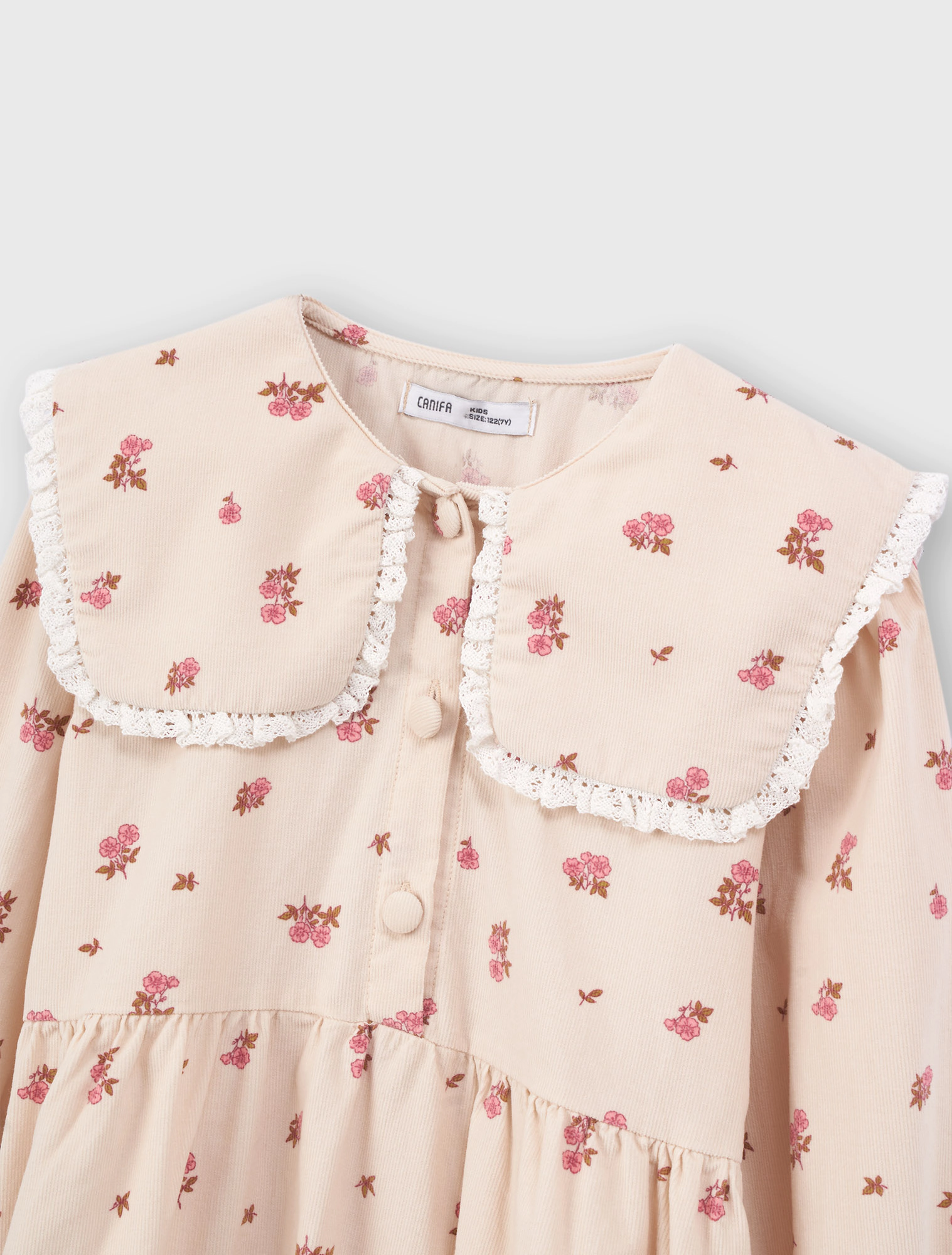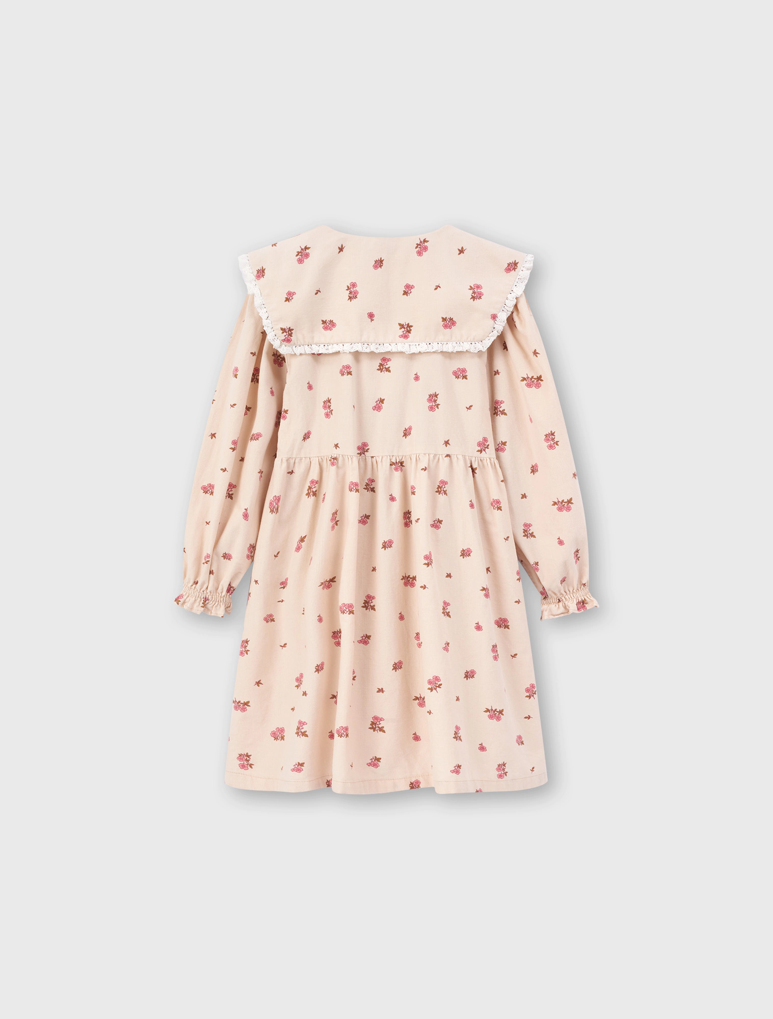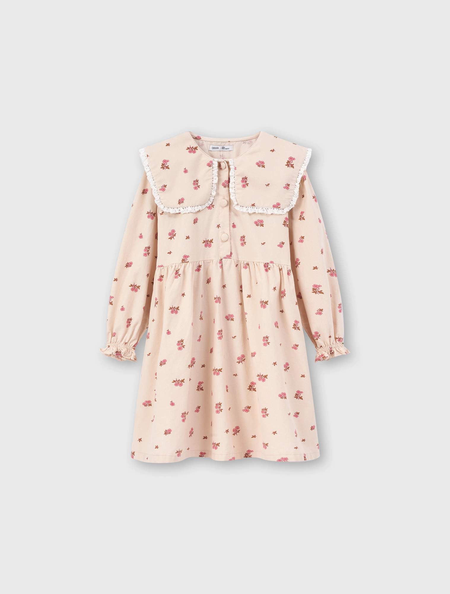Váy liền bé gái hoạ tiết. Cổ áo to bản tạo sự sự nữ tính với chi tiết bèo ren.