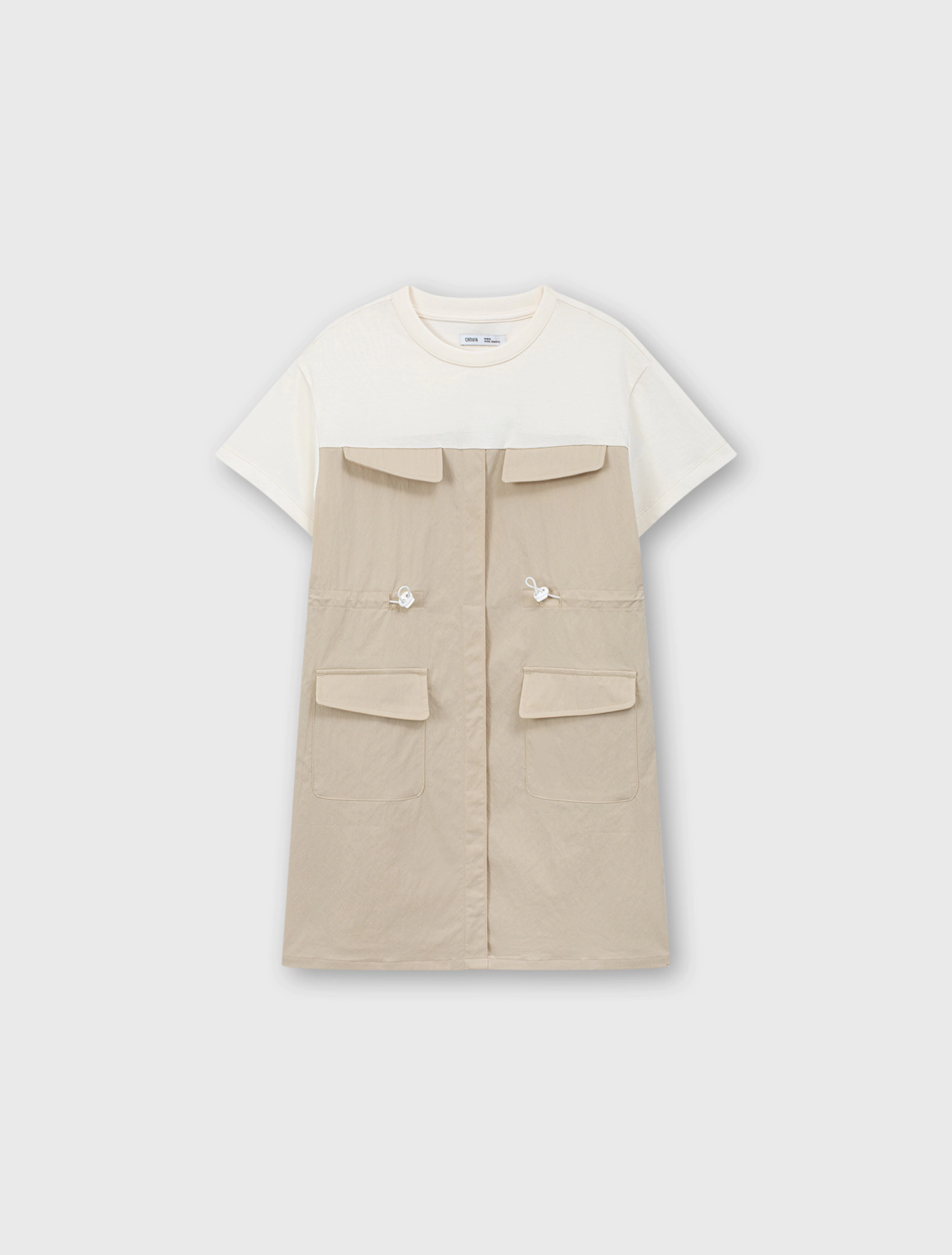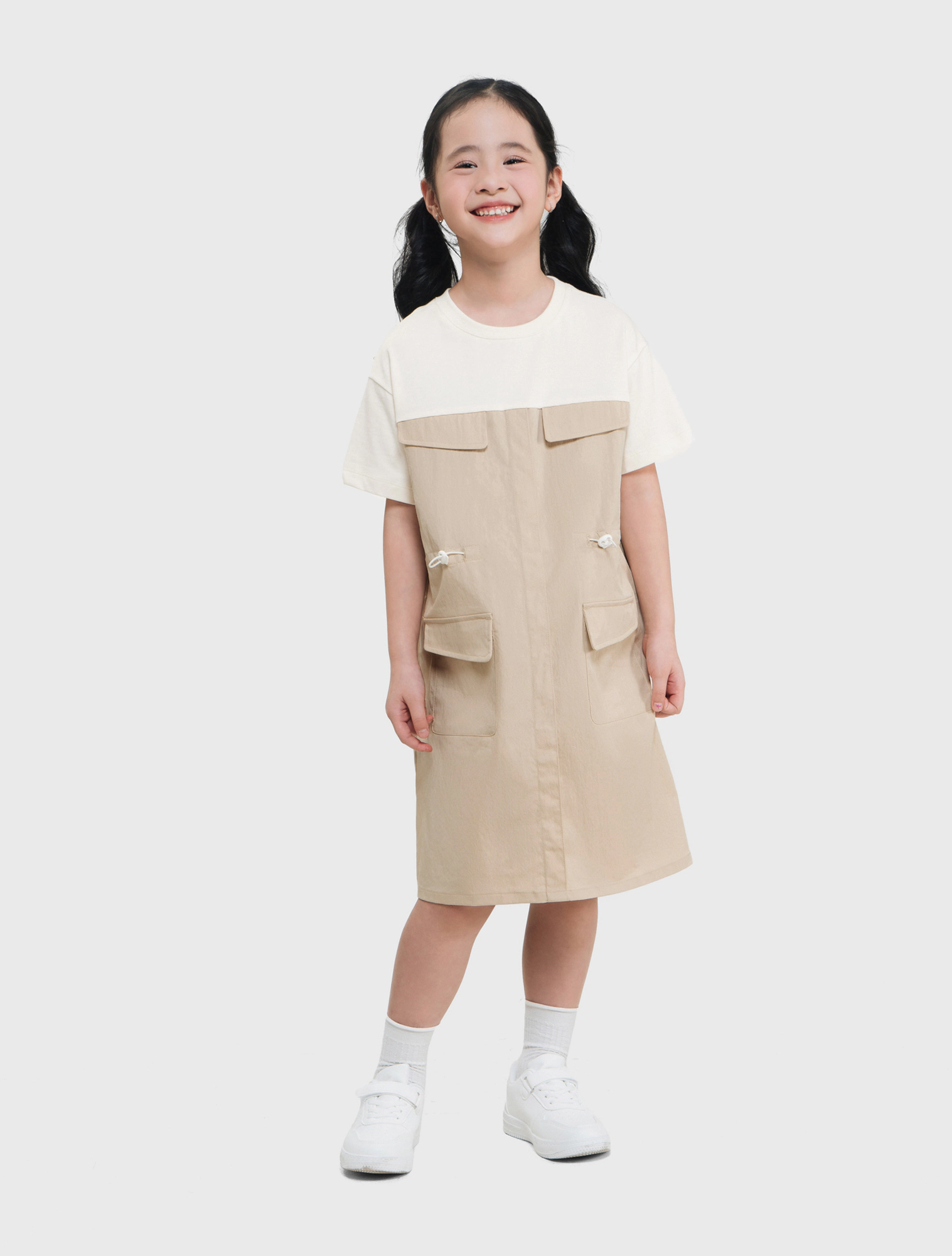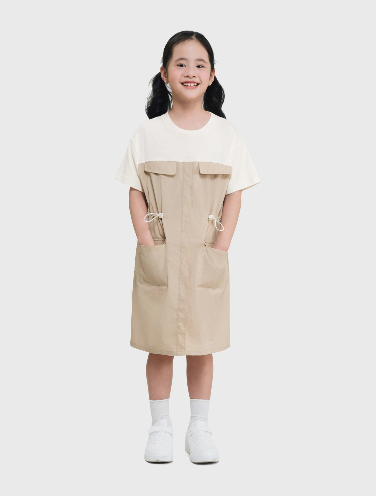 Váy liền bé gái, khaki nhăn phối vải cotton tạo sự năng động nhưng vẫn có sự nữ tính. Sản phẩm phù hợp với những hoạt động vào thời tiết giao mùa.