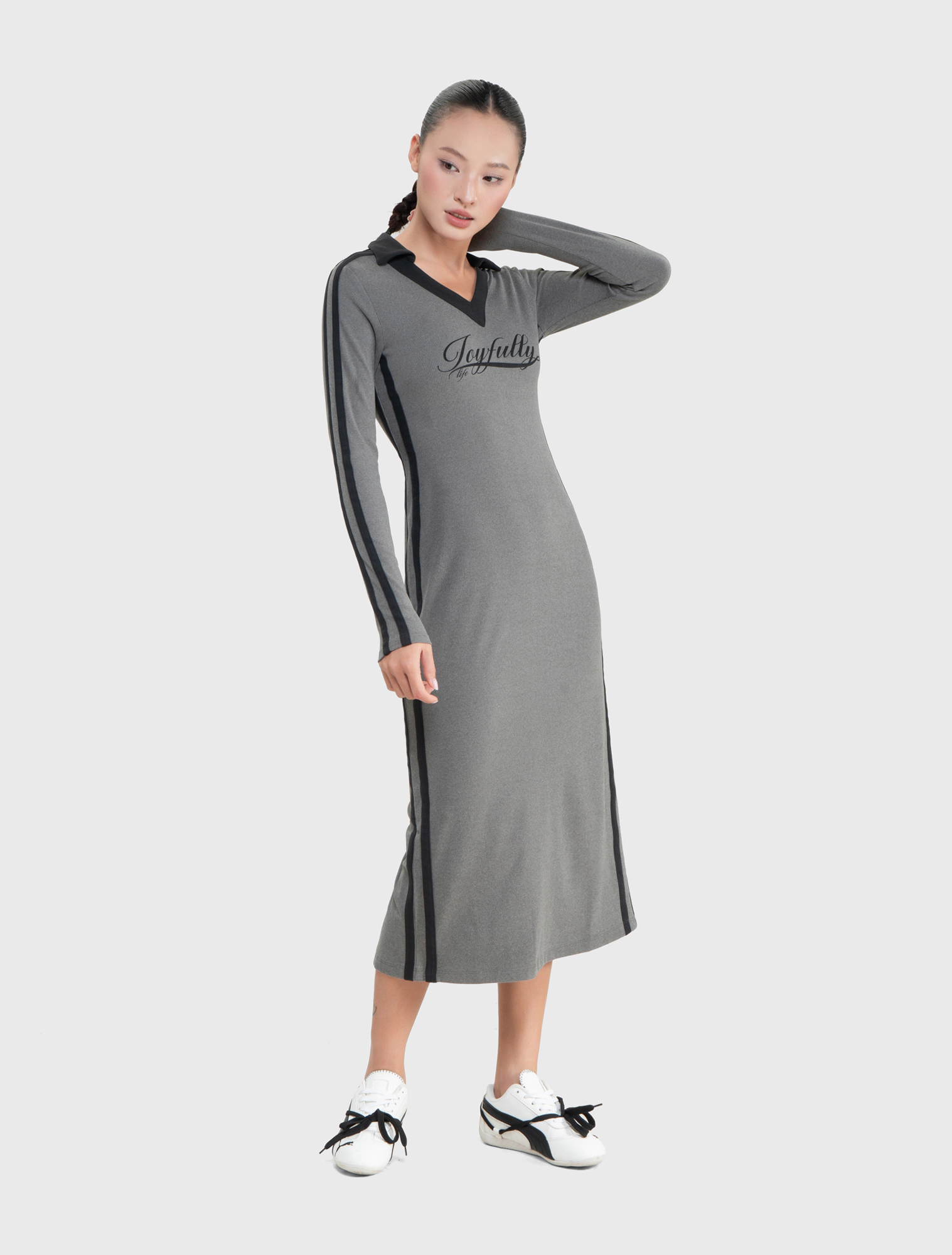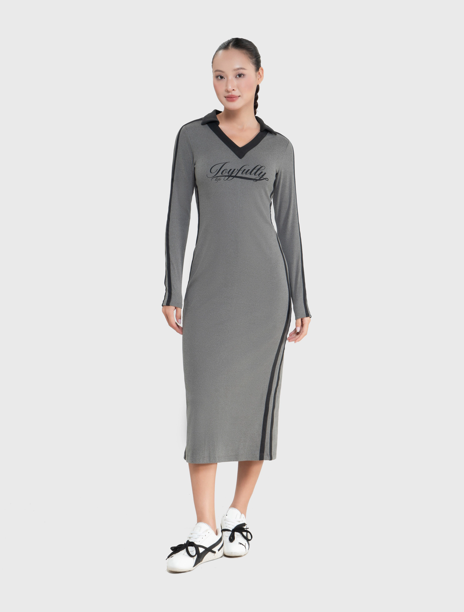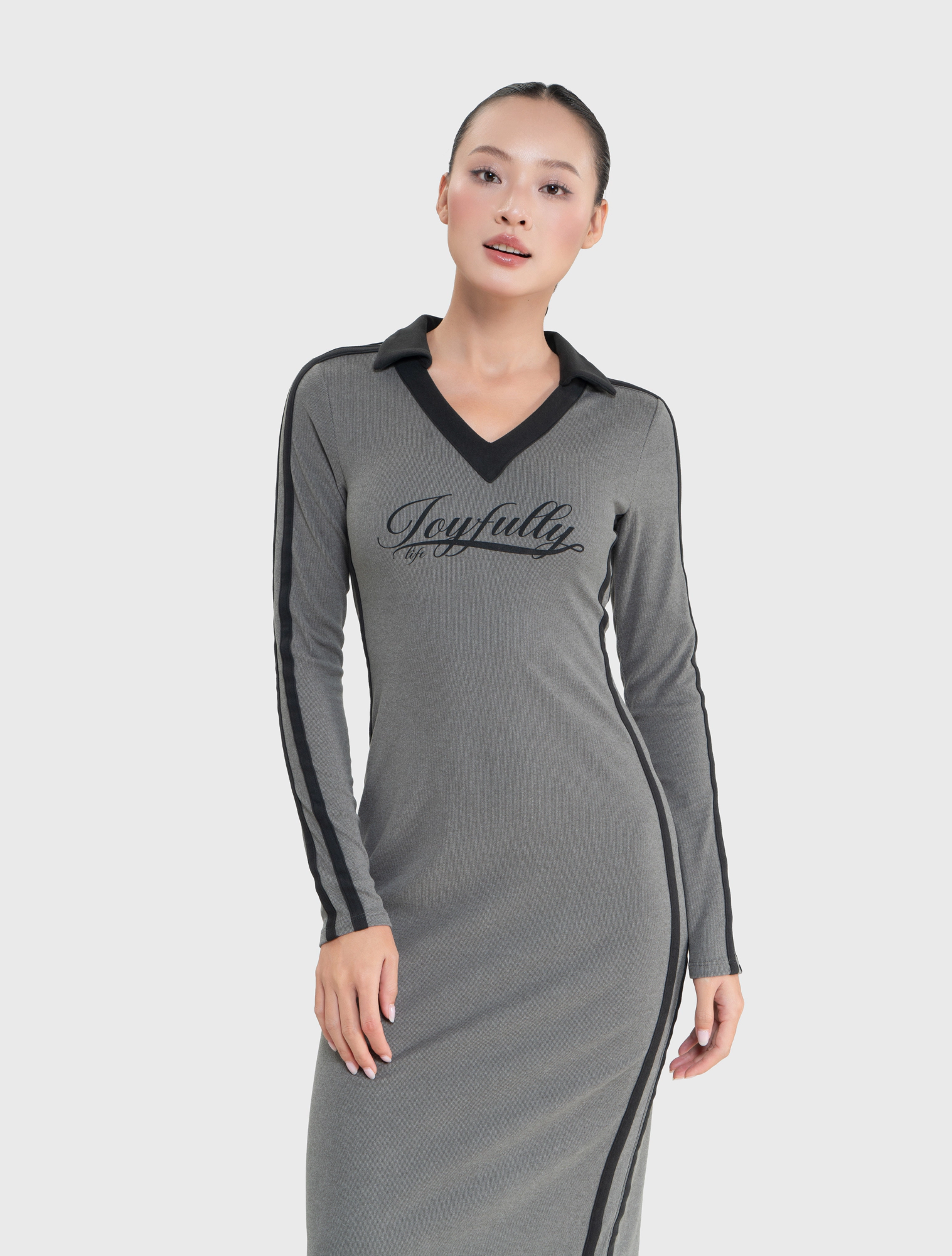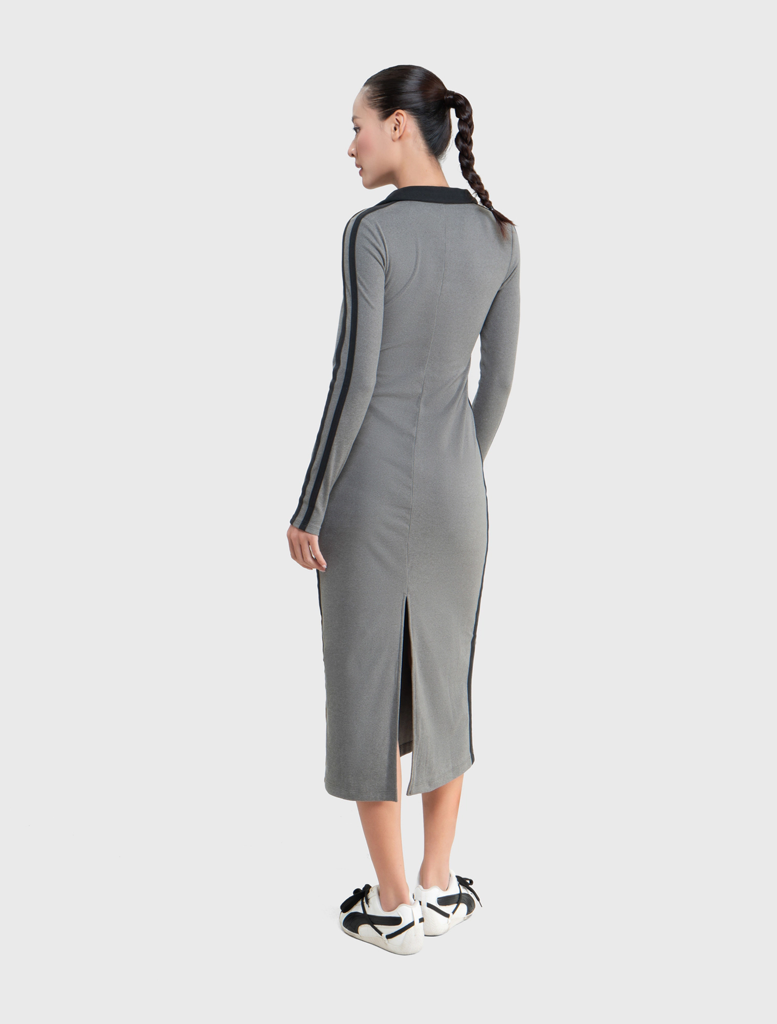 Váy liền nữ dáng ôm dài kiểu dáng thể thao với chi tiết phối màu dọc 2 bên sườn váy và cổ áo,
